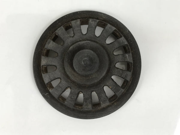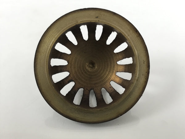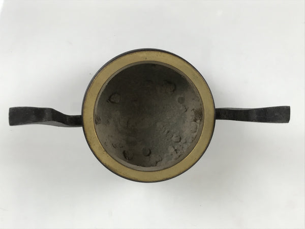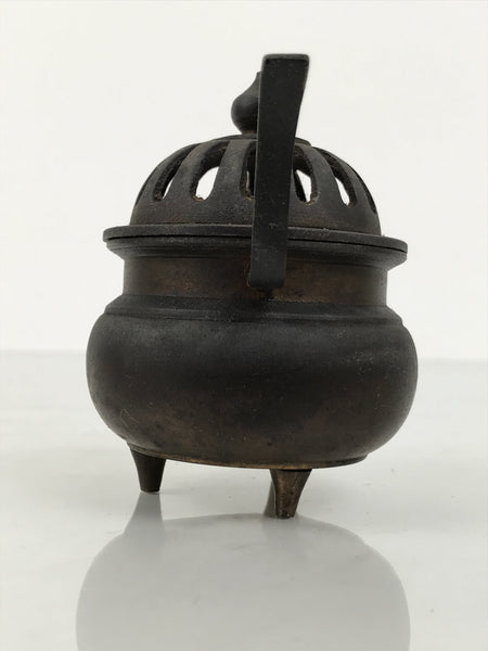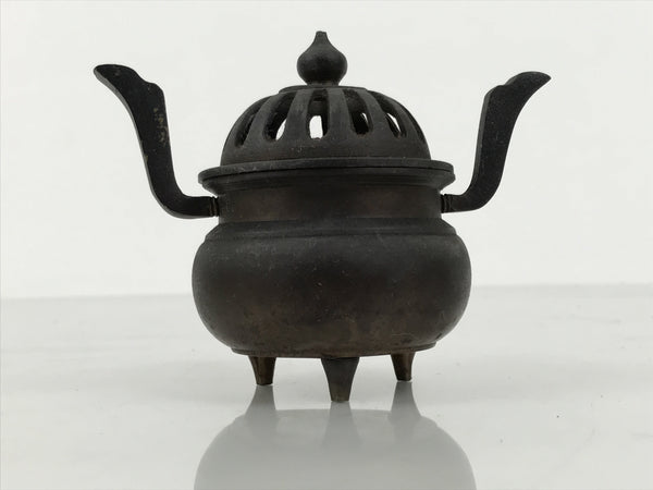 This is a vintage Japanese Buddhist brass incense burner (koro) commonly used in Buddhist altars. It is a small pot made of aged, browned brass with decorative vertical-facing side pieces and a loose-fitting caged lid. It is used for burning incense powder, chips, or sticks. Burning incense is a means of purifying the body of the worshiper.