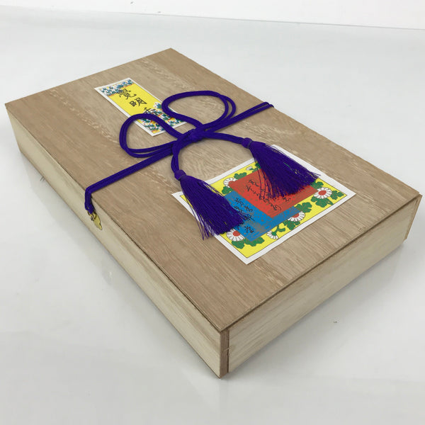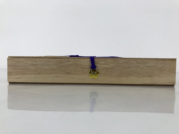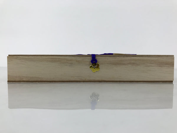 These are vintage Japanese Buddhist o-senko, incense sticks cased in a wooden box. It contains about four hundred and fifty-five sticks; seven bundles of incense sticks, and about sixty-five incense sticks in a bundle. Red paper bundling the sticks has a Japanese inscription. Purple string ties the wooden box and the lid, and the string is set with plum blossom-shaped metal parts on the box sides.