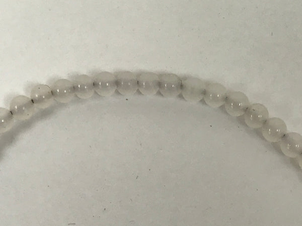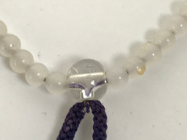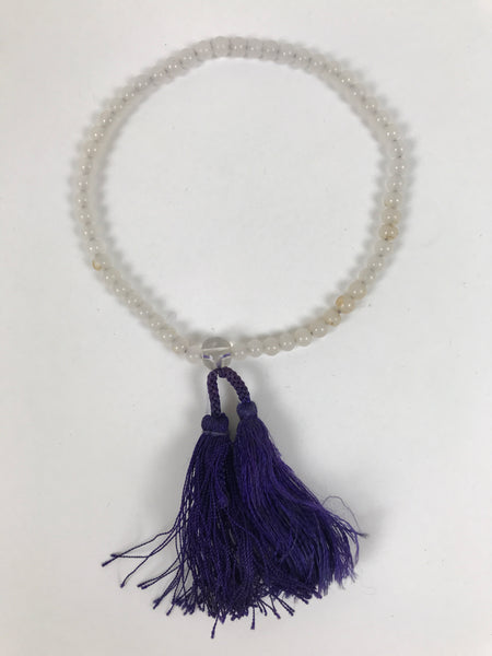 This is a vintage Japanese Buddhist prayer rosary bracelet, Juzu. It is made of small, semi-opaque white glass beads. At the bottom is a large, clear glass bead, and there are purple tassels. This style is commonly used as a portable juzu for on-the-go and across various sects.