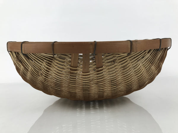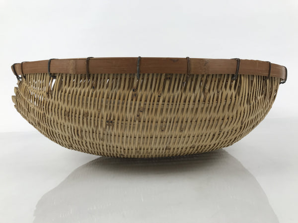 This is an antique traditional natural bamboo woven basket used for drying or draining water from various items such as tea leaves, small vegetables like edamame pods, etc. This particular type of handwoven zaru has one open side, giving it the name Kataguchi-zaru, and is bound together by metal wire.