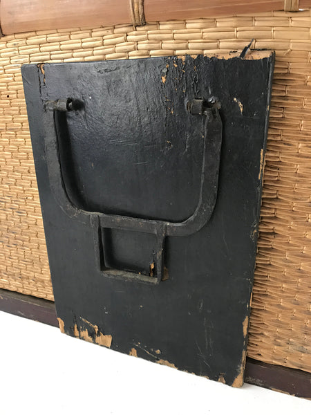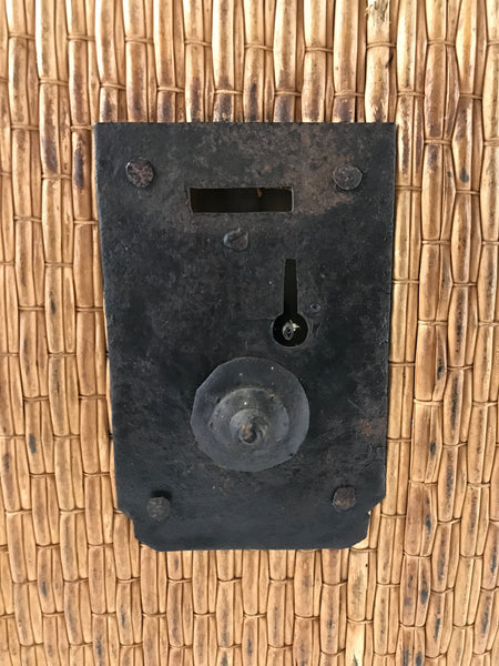 This is a natural bamboo woven basket used for storing and transporting items. It has a wooden bottom frame for stability and corner brackets. It has cast iron handles on a wooden panel on each side and the inside is lined with thin black paper. This unique traveler's chest contains a hook on one side and a locking mechanism on the other (originally it had a lid and strap for security).
