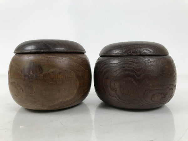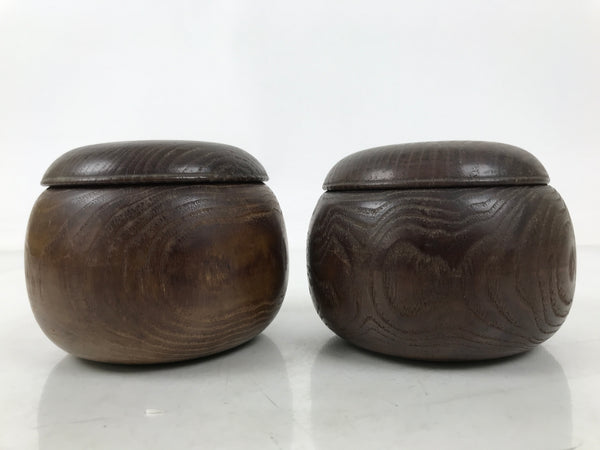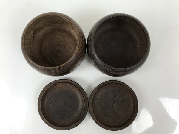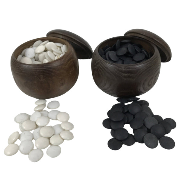 This is a vintage goishi, or go stone, set used to play the popular strategy board game Igo, or Go. This beautiful set of game pieces made from black stone and white glass is contained in lidded dark brown wooden bowls for easy, decorative storage.