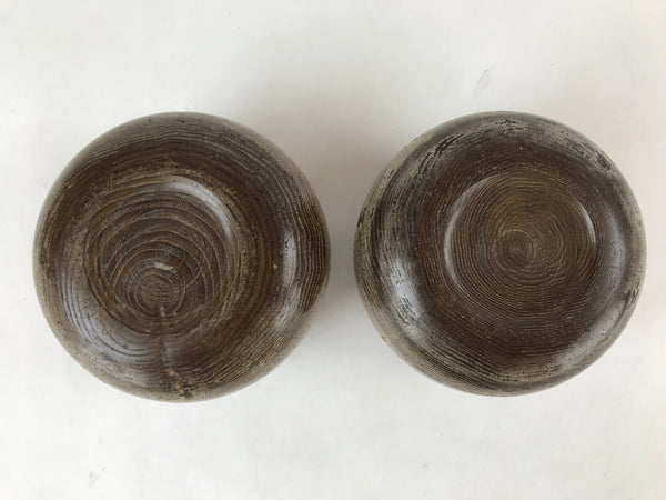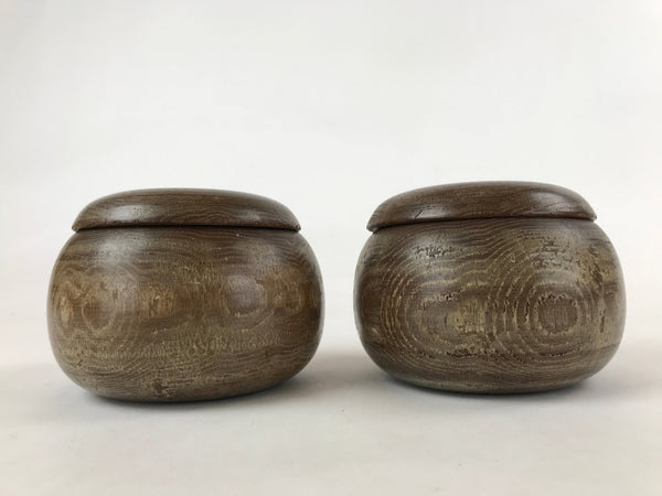 This is a vintage goishi, or go stone, set used to play the popular strategy board game Igo, or Go. This beautiful set of game pieces made from black and white glass is contained in lidded muted brown wooden bowls for easy, decorative storage. Black stones are mixed sizes (likely from adding replacements to lost of broken piece over time).