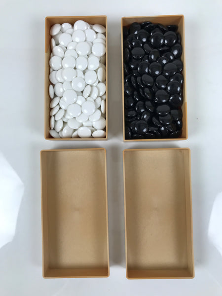 This is a vintage go (igo) game set used to play the popular strategy board game Igo, or Go. It comes with a small-sized 19x19 resin folding go board (goban) and both white and black resin game pieces in small resin storage boxes. It comes in the original paper box with game rules and instructions.