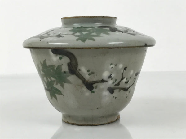 Japanese Ceramic Lidded Bowl Mushiwan Cup Pottery Gray White Plum Blossoms Y470