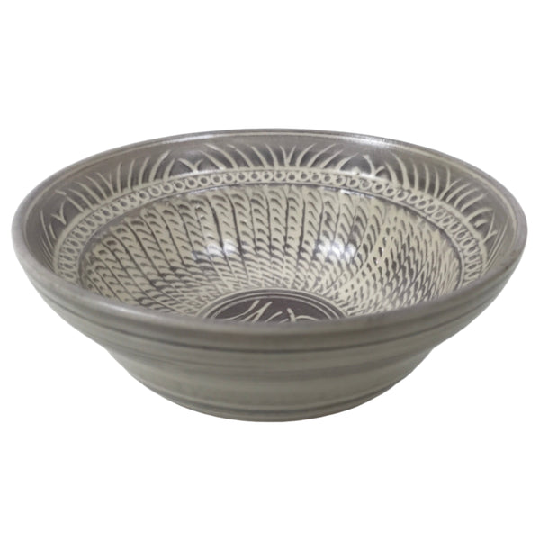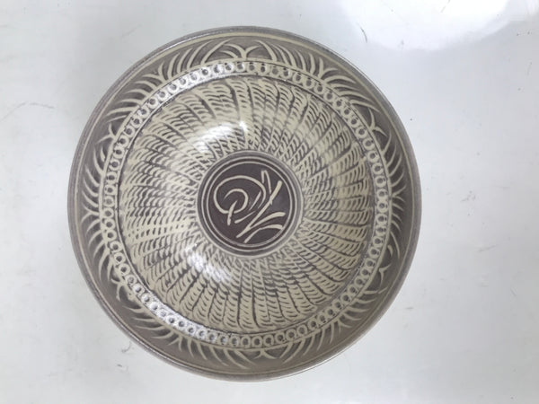 This vintage Japanese Mishima yaki ceramic pottery small bowl, also called kobachi, is gray with a busy white line and loop design on the inside, and a banded design on the outside. It has a ridge on the inside for added dimension and is perfect for side dishes and desserts.