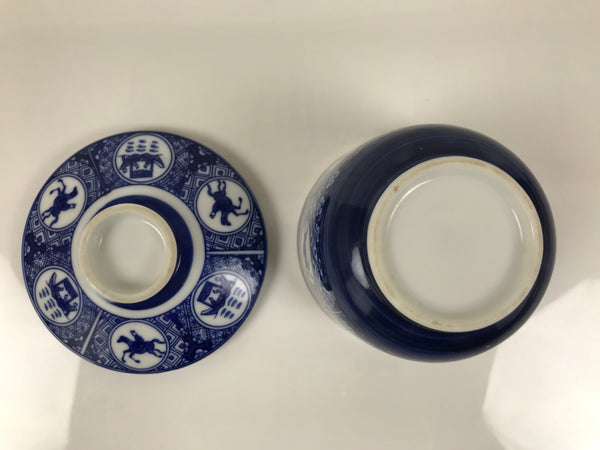 This is a Japanese vintage porcelain bowl with a lid, mushiwan. Mushiwan is used when cooking chawanmushi, steamed egg custard.  This blue and white bowl features a hexagonal pattern base, a design of a boat with people, and a horse with a man in a circle framed by a lattice pattern.