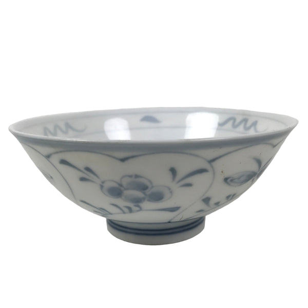 This item is a vintage Japanese Mino Ware porcelain rice bowl. This wide-mouthed small bowl is white with a blue design commonly known as "Shepard's Purse" that contains leaves, vines, and clusters of seeds. It can also be used for side dishes or as a chawan for drinking tea. Rice bowls are made to be lightweight and held in one hand (thumb on rim, other fingers on foot).
