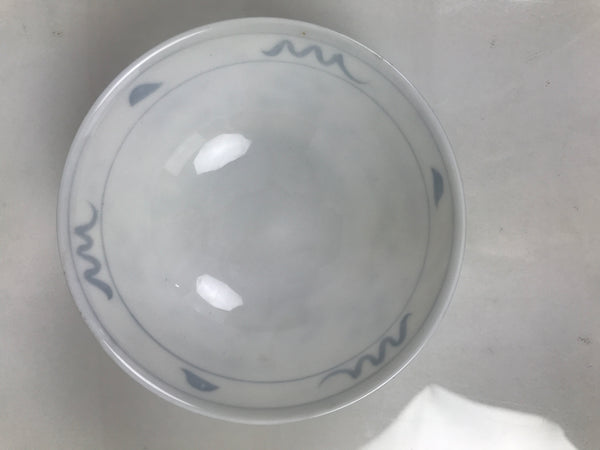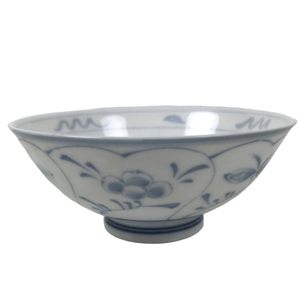 This item is a vintage Japanese Mino Ware porcelain rice bowl. This wide-mouthed small bowl is white with a blue design commonly known as "Shepard's Purse" that contains leaves, vines, and clusters of seeds. It can also be used for side dishes or as a chawan for drinking tea. Rice bowls are made to be lightweight and held in one hand (thumb on rim, other fingers on foot).