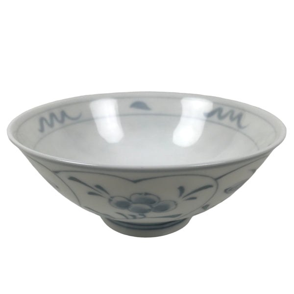 This item is a vintage Japanese Mino Ware porcelain rice bowl. This wide-mouthed small bowl is white with a blue design commonly known as "Shepard's Purse" that contains leaves, vines, and clusters of seeds. It can also be used for side dishes or as a chawan for drinking tea. Rice bowls are made to be lightweight and held in one hand (thumb on rim, other fingers on foot).
