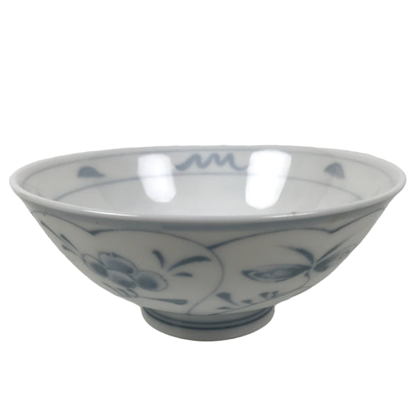 This item is a vintage Japanese Mino Ware porcelain rice bowl. This wide-mouthed small bowl is white with a blue design commonly known as "Shepard's Purse" that contains leaves, vines, and clusters of seeds. It can also be used for side dishes or as a chawan for drinking tea. Rice bowls are made to be lightweight and held in one hand (thumb on rim, other fingers on foot).