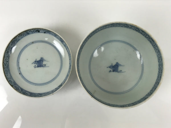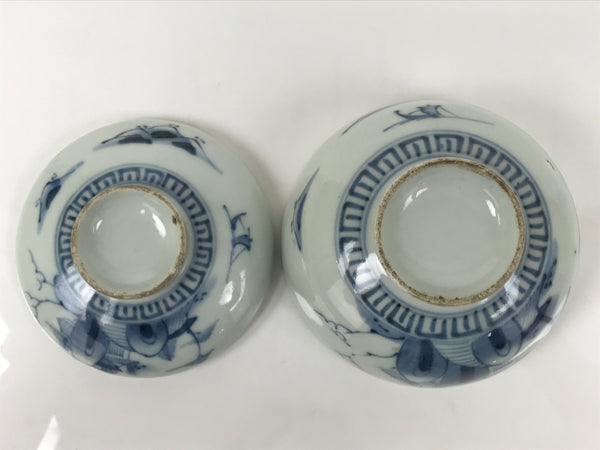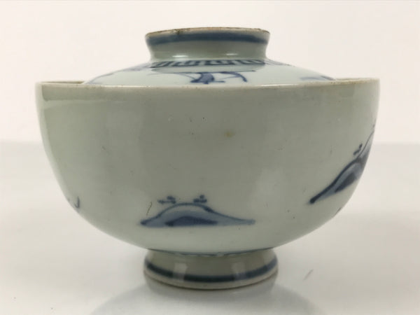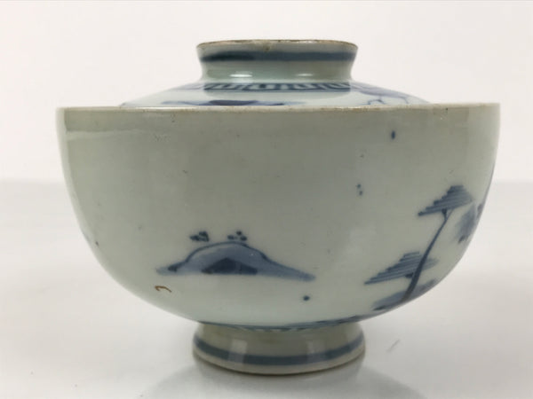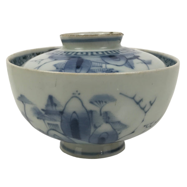 This is a Japanese vintage porcelain lidded rice bowl. The bowl is decorated with sometsuke-style blue depiction of a village on the sea. There are also rocks jutting out from the water with sailboats. It is the ideal size to serve soup, rice, or other small foods.