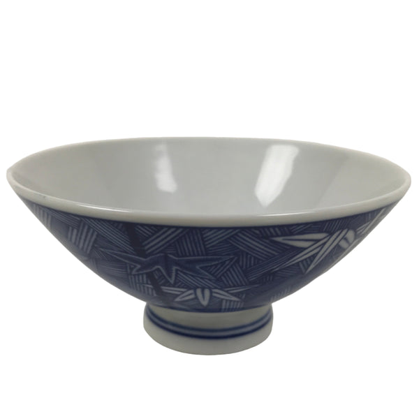 This item is a vintage Japanese porcelain rice bowl. The design on this wide-mouthed small bowl features a sometsuke white and blue design of stalks of bamboo in front of what appears to be a woven basket-like background. The foot of the bowl has two simple blue bands for decoration. It can also be used for side dishes. Rice bowls are made to be lightweight and held in one hand (thumb on rim, other fingers on foot).