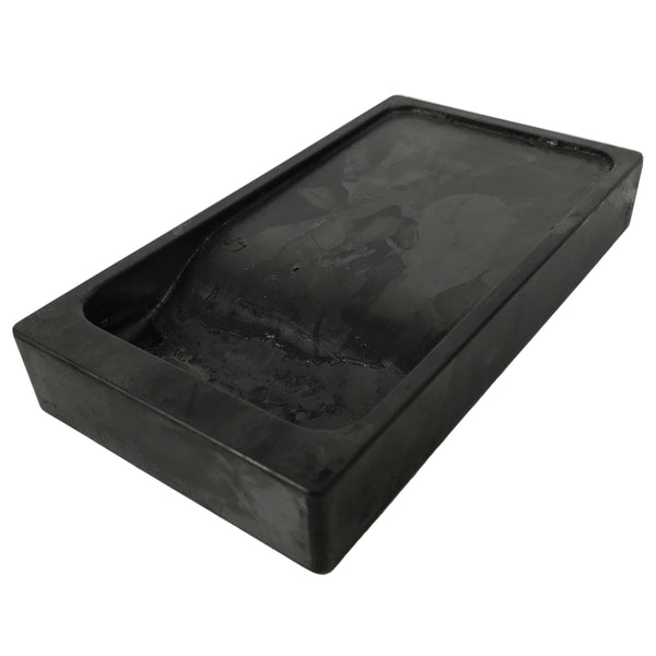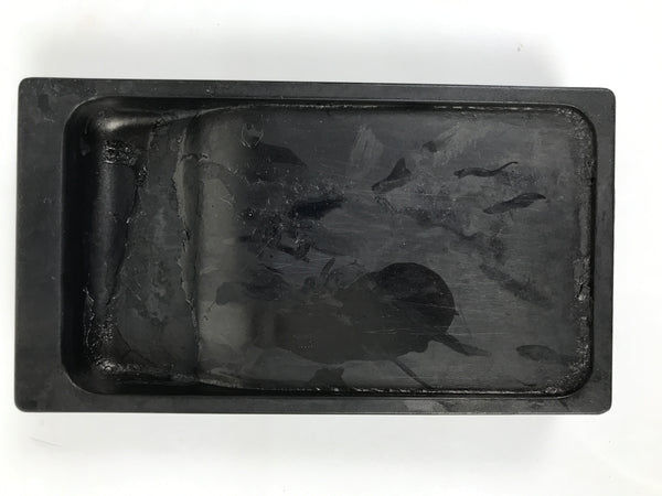 This is a vintage Japanese inkstone, suzuri, used for grinding sumi and holding ink. It is a necessary tool in calligraphy (shodo) and traditional penmanship (shuji). It is made of a black stone. The surfaces are smooth.