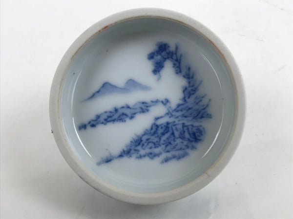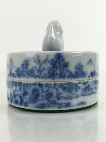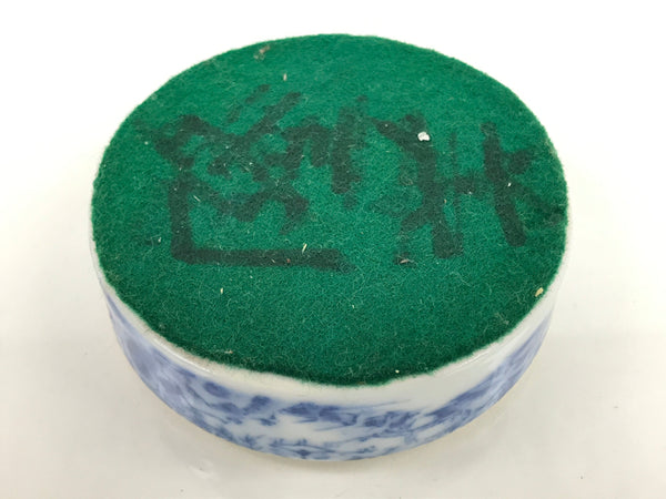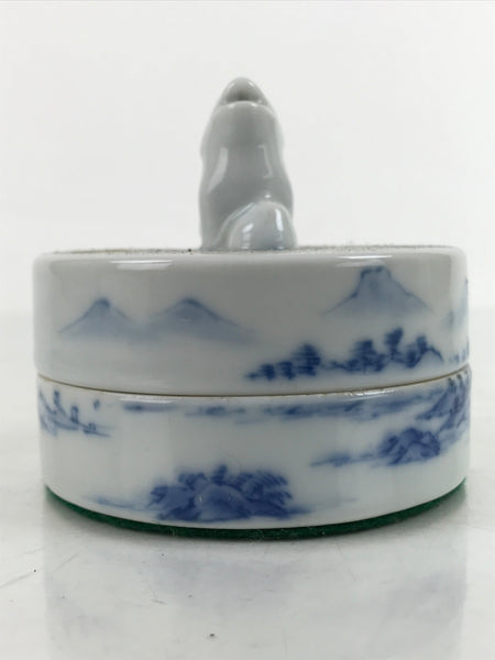 This is a vintage Japanese vermilion ink pad container with a lid. This container is for ink used for Hanko or Inkan, the Japanese seals. This blue and white porcelain container is Arita ware. The handle is in the shape of Shishi or lion. Mountainous scenery is painted on the surface. Green felt fabric is pasted on the bottom. Ink is not included.