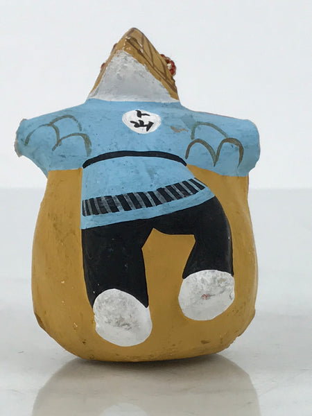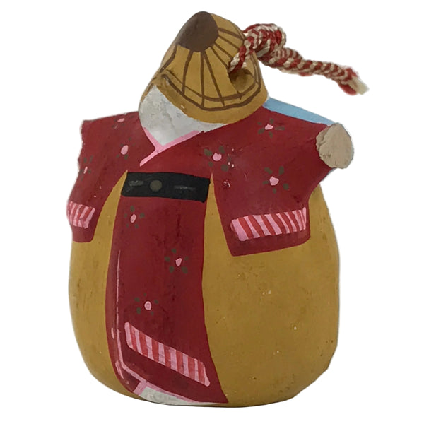 This is a vintage Japanese clay bell, Dorei or Tsuchi-Suzu. This dorei has a classic bell shape, but on either side is the male and female attire worn during the Awa Odori, a famous summer festival dance in Tokushima Prefecture on the island of Shikoku. Perhaps the most iconic piece is the narrow straw hat worn by female dancers specifically along with a bold-colored yukata. The male dress is a happi (small jacket) with tabi. There is a small white clay ball inside as well as a red and white string tied at the top.