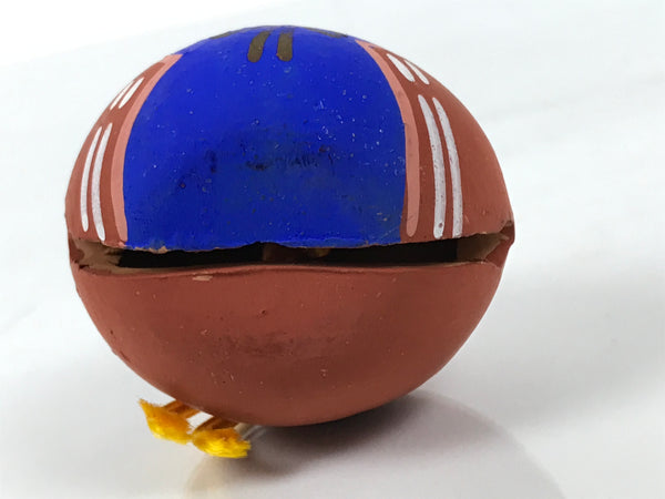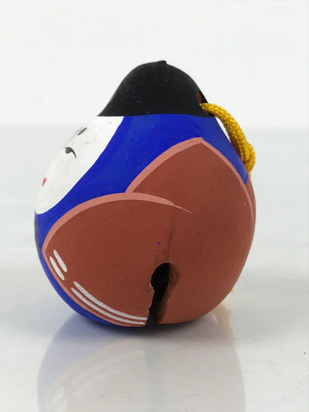 This is a vintage Japanese clay bell, Dorei or Tsuchi-Suzu, in the shape of a Hina doll. The character featured is the prince/emperor in an adorable round shape and is painted blue and red. Usually these come in a pair, the other half of the set being a princess/empress. It has a small brown clay ball inside and a yellow string tied at the top. Hina Matsuri is an annual festival on the 3rd of March each year that celebrates girls with elaborate displays of dolls representing royal courts of old times.