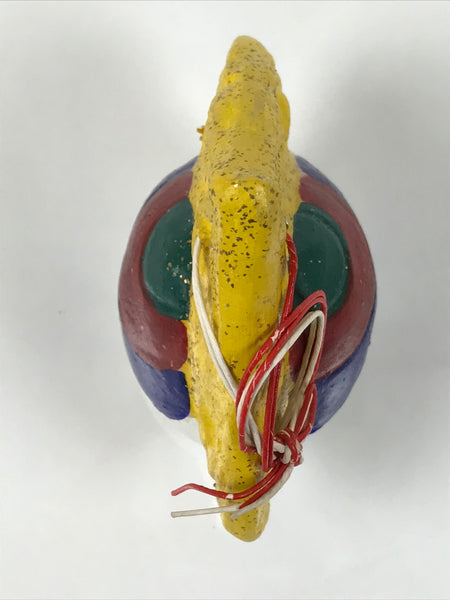 This is a vintage Japanese clay bell, Dorei or Tsuchi-Suzu. This dorei is in the shape of a houshu no tama, a pear-like emblem with small flames, a common symbolic feature in inari shrines across Japan. This item is carried by fox spirits and said to grant wishes. It is painted yellow, red, green, and blue with gold glitter on the flame section. There is a small brown clay ball inside as well as a red and white string tied at the top.
