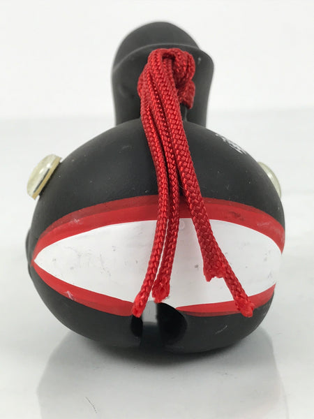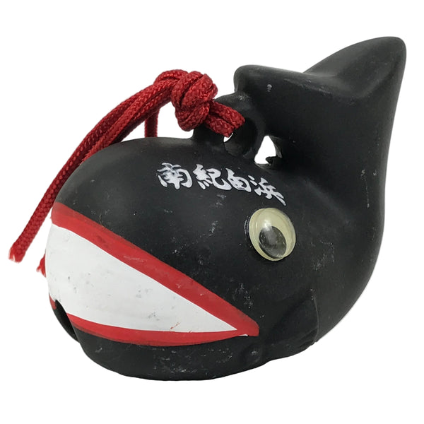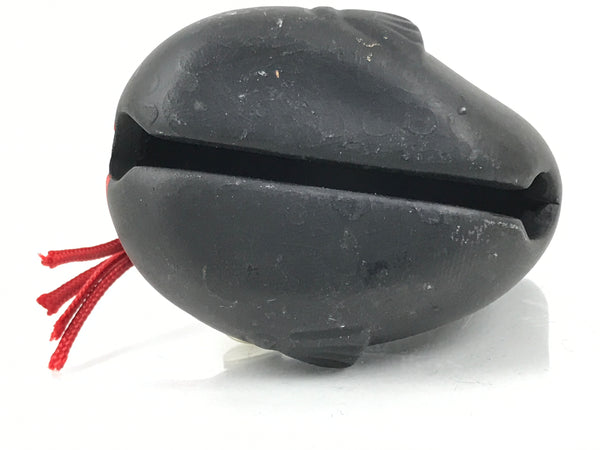 This is a vintage Japanese clay bell, Dorei or Tsuchi-Suzu. This dorei is in the shape of a grinning black whale (kujira). It has resin eyes. There is a black clay ball inside as well as a bright red string tied at the top. This is a souvenir item from Nanki Shirahama, an area in western Wakayama.