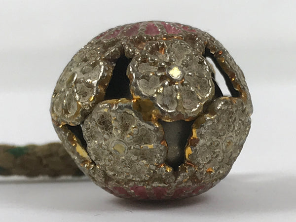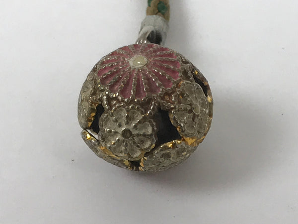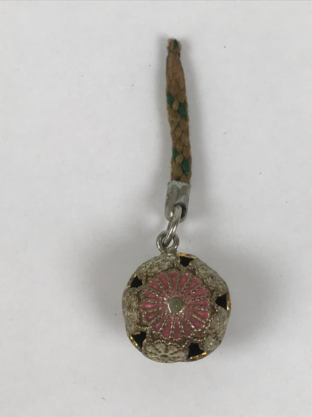This is a vintage Japanese metal chrysanthemum (kiku) bell keychain or phone strap. The ball shape is made of two large flowers on the sides in pink and smaller ones painted white. There is a broken braided string at the top that needs replacing.