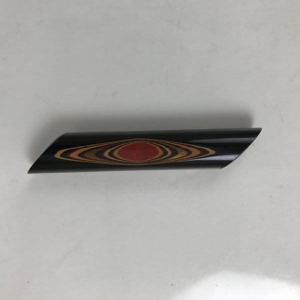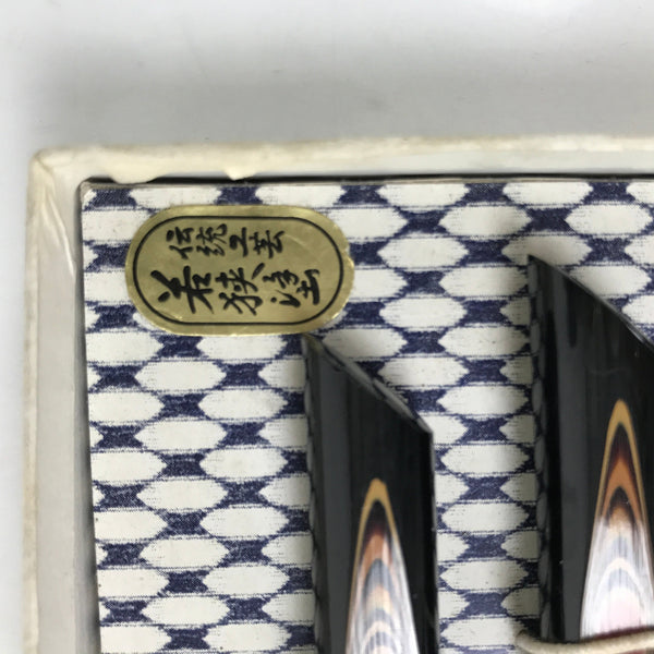 This is a set of five Japanese vintage lacquered wooden chopstick holders. The set is made of Wakasa-style lacquer in black with a gold and red circle pattern at the center. Each chopstick rest is wide and slightly curved at the center. The set comes with the original paper gift box (the lid is missing).