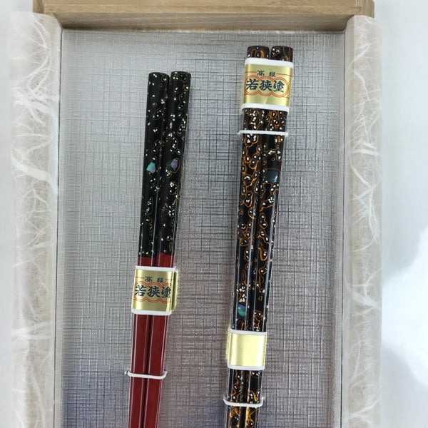 This is a Japanese vintage lacquered wooden set of chopsticks. This set is Wakasa style lacquer in red and black respectively with gold accents that mimic ripples. The main feature, however, is the slices of raden (mother-of-pearl/abalone) shell embellishments set into the upper parts.
