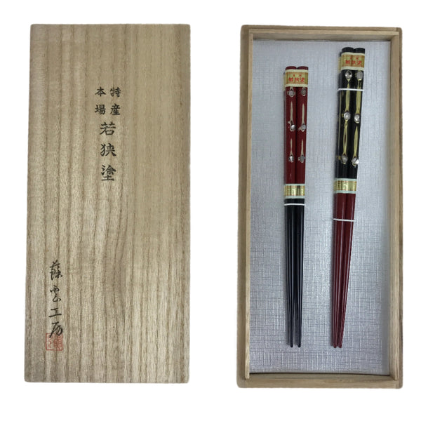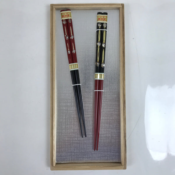 Japanese Lacquered Wooden Chopstick Pair Set Vtg Wakasa Raden Red Black L301