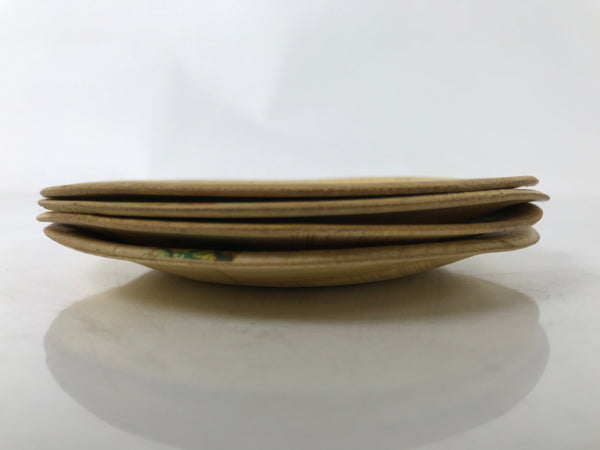 This is a four-piece set of vintage Japanese souvenir bamboo drink saucers/coasters. These coasters are made of bamboo and are a souvenir from Okinawa. They feature a woman in traditional Okinawan dress dancing. There is a circular indent at the center to hold a drink in place.