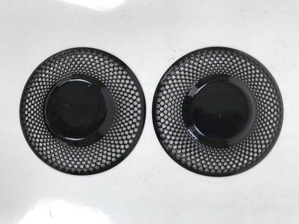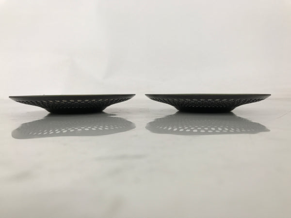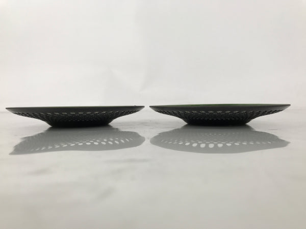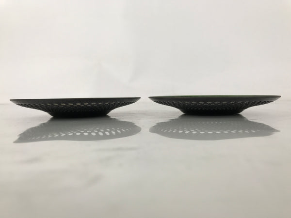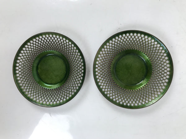 This is a pair of vintage Japanese metal chataku drink saucers/coasters. They are green with a punched hole design. The center has a traditional alternating stripe pattern (sangokuzushi) and is sunken to provide stability so cups do not slide off easily. The pair stacks neatly and is very thin, so they do not take up much space in storage. The back side is black.