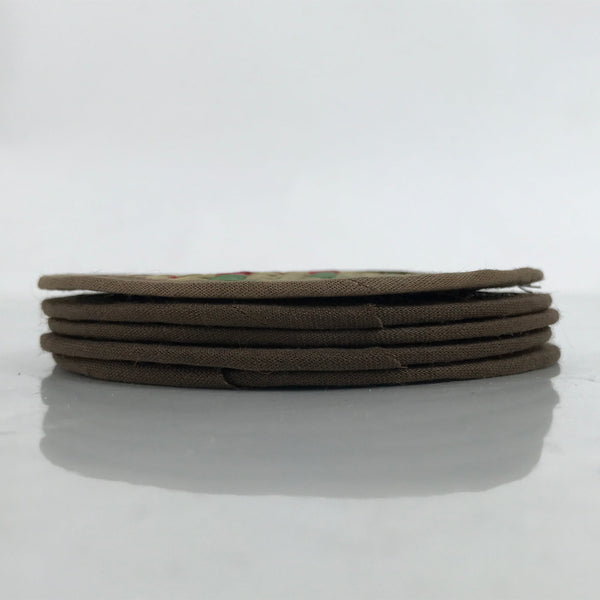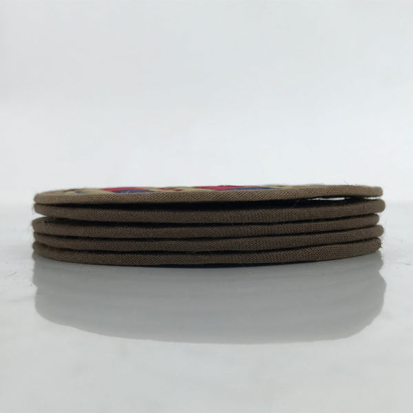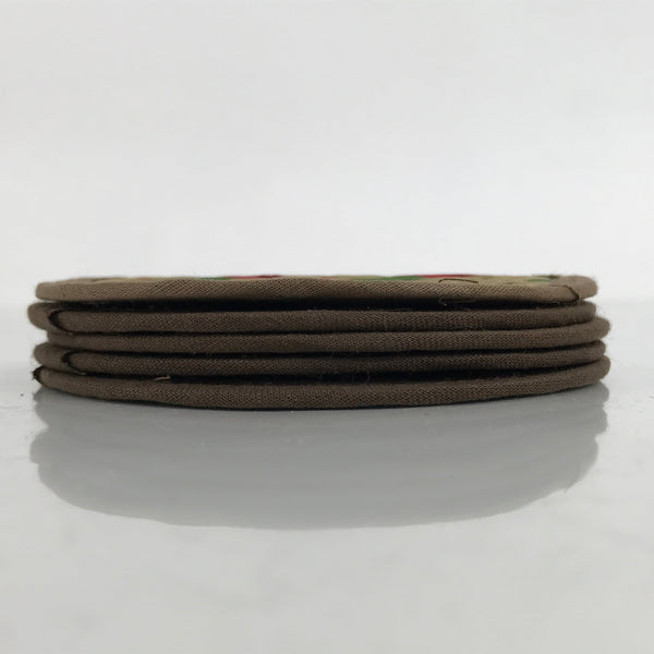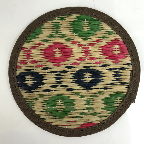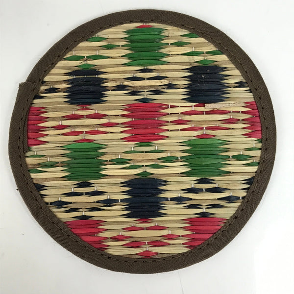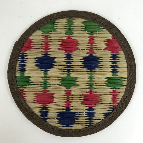 This is a five-piece set of vintage Japanese handwoven straw tatami drink saucers/coasters, or chataku. Handwoven straw mimicking the traditional tatami mats found in many Japanese homes, temples, etc, this set of folk art coasters each have their own pattern in red, green, and blue. The edges are finished with sewn on brown fabric. They are lightweight and do not take up much space.