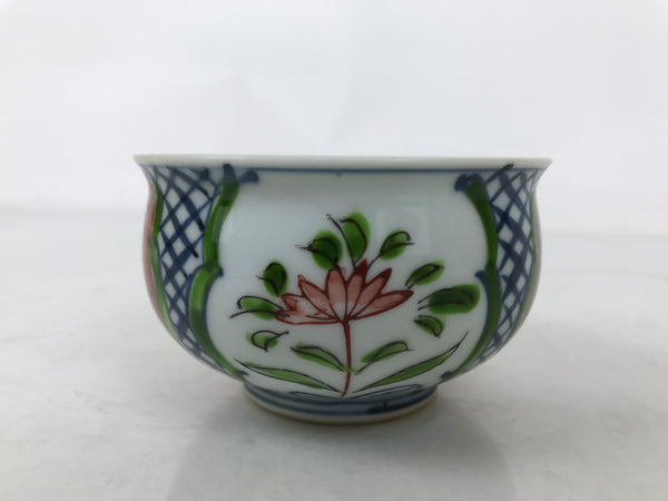 This is a Japanese vintage tea cup (Yunomi). It is in an Arita ware style with separated designs of lotus flowers in red and white. The middle parts are a blue mesh pattern, and there is a thin blue line on the inside of the rim. It is signed on the bottom. This cup is for serving sencha (steeped loose leaf tea).