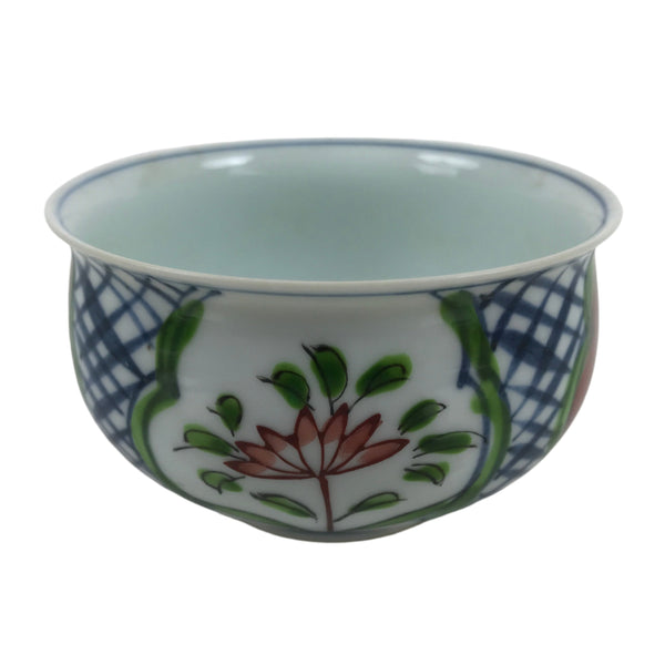 This is a Japanese vintage tea cup (Yunomi). It is in an Arita ware style with separated designs of lotus flowers in red and white. The middle parts are a blue mesh pattern, and there is a thin blue line on the inside of the rim. This cup is for serving sencha (steeped loose leaf tea).