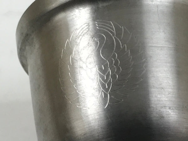 This is a vintage Japanese Buddhist metal water/tea offering cup (chaki) commonly used in Buddhist altars. It is a unique chalice shape that consists of a platform base, a cup and a lid all made of the same metal. There is an engraved crane on the front side. The crane is the Nichiren Shoshu sect mon symbol.