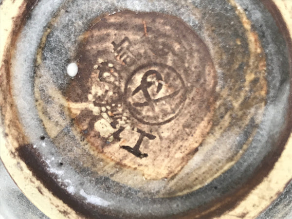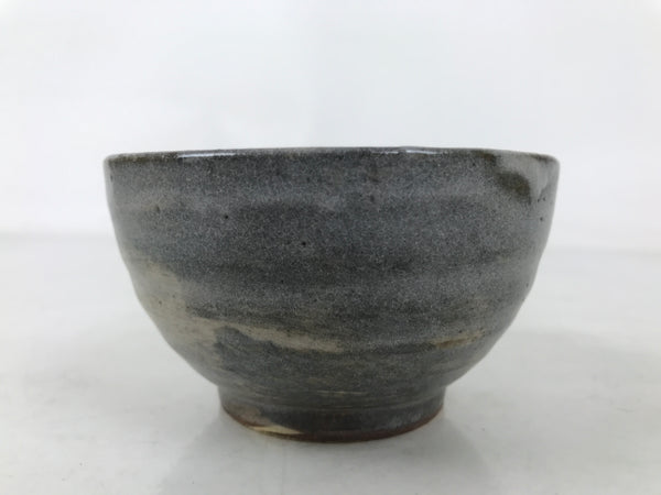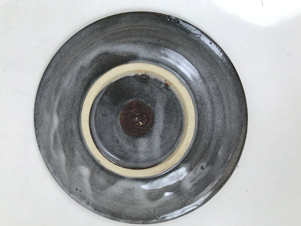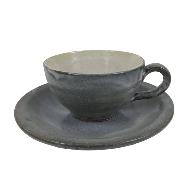 This is a vintage Japanese ceramic coffee cup and its saucer. It is gray with a white glaze on top on the outside and beige on the inside. The saucer is gray. There are writings on the bottom, indicating it's a commemorative cup to celebrate the completion of a factory.  This cup is perfect for enjoying coffee or tea.