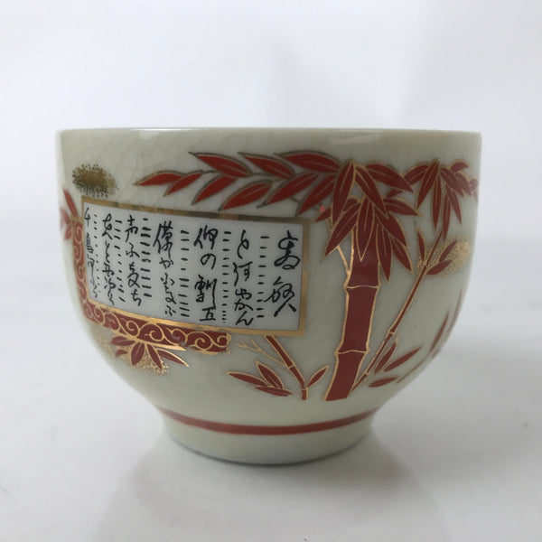 This is a vintage Japanese Kutani ware ceramic teacup with a crackle glaze. It is beige and features a design of red bamboo rimmed gold and a Tanka or Japanese poem-like characters. A signature read Kutani is on the bottom.  It is used for drinking sencha loose-leaf tea.
