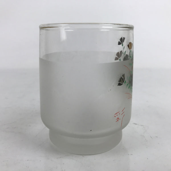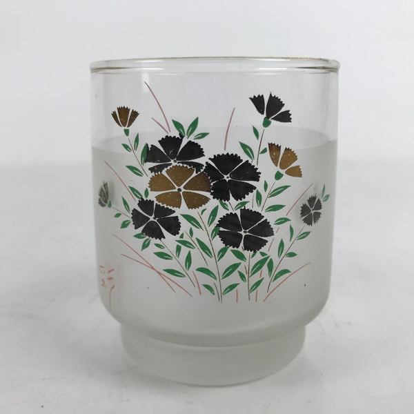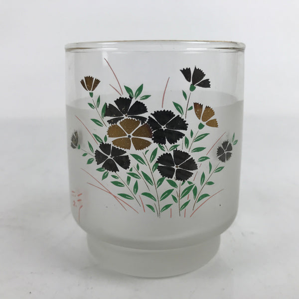 This is a Japanese vintage glass tea cup (Yunomi). It is partially frosted with a black and gold painted carnation (nadeshiko) floral design on the front and has a gold rim. This cup is for serving refreshing, cool drinks during summer such as barley tea (mugicha).
