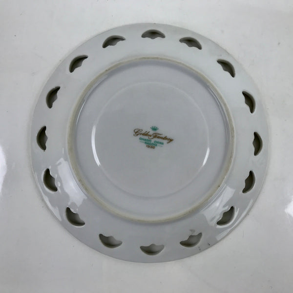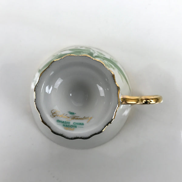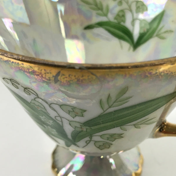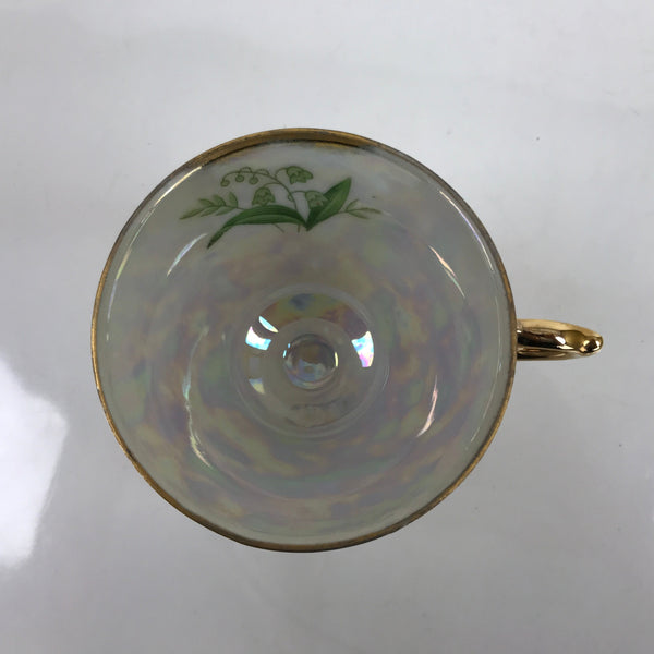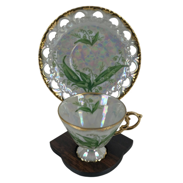 This is a vintage Showa-era Japanese porcelain china teacup with matching saucer. It is manufactured in 1932 by Ohashi China in Nagoya, Japan and is a gorgeous example of lusterware. This cup and saucer have a pearlescent, eye-catching look with gold accented edges and handle. The main image is lily of the valley, and the pattern is called "Golden Fantasy". Both the cup and saucer have a maker's mark on the bottom. It comes with a decorative wooden stand for display.