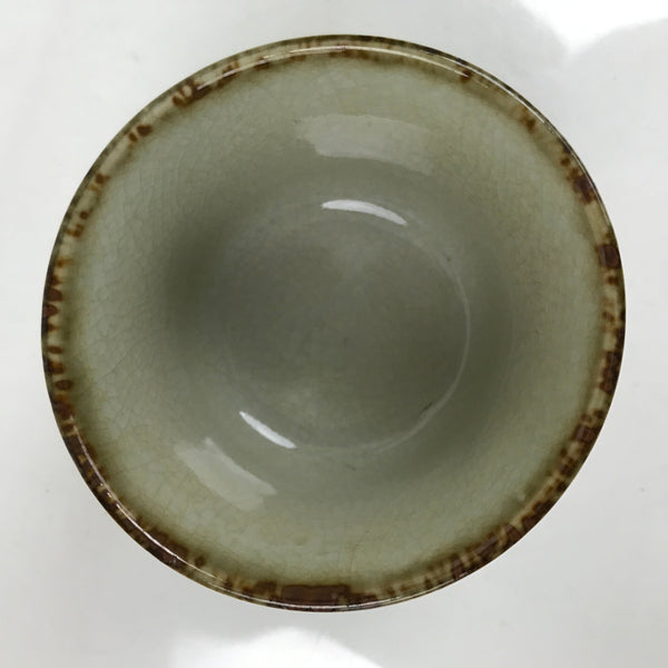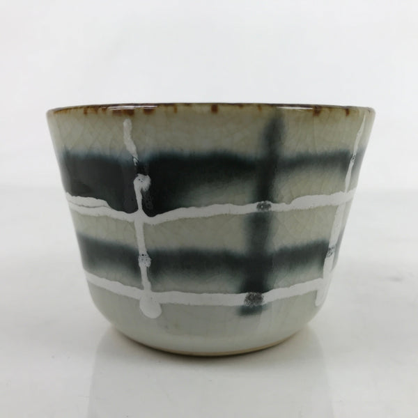 This is a Japanese vintage tea cup (Yunomi). The teacup is mostly gray and beige crackled glaze with a brown rim and cozy black and white grid line pattern on the side. This cup is for serving sencha (steeped loose leaf tea).