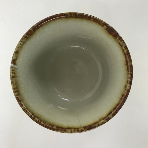 This is a Japanese vintage tea cup (Yunomi). The teacup is mostly gray and beige crackled glaze with a brown rim and cozy black and white grid line pattern on the side. This cup is for serving sencha (steeped loose leaf tea).