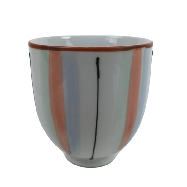 This is a Japanese vintage tea cup (Yunomi). The teacup is white with colorful red, green, and blue vertical stripes and thin, textured black lines. This cup is for serving sencha (steeped loose leaf tea).