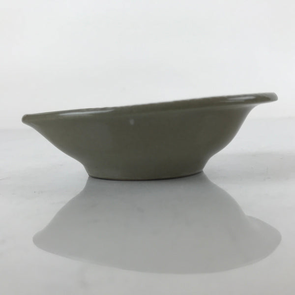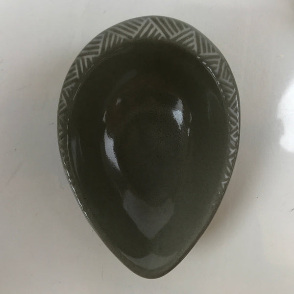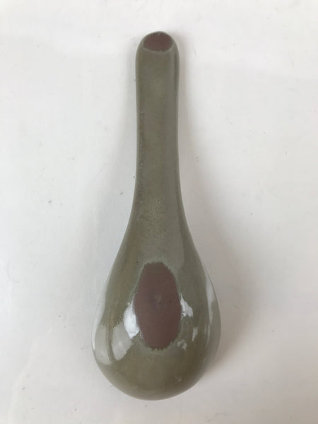 This is a Japanese vintage ceramic spoon with matching stand/rest. This type of spoon (chirirenge/renge) is used when eating ramen noodles or other soup dishes like nabe hot pot. They can also be used to eat fried rice. The spoon has an easy to hold handle and features a solid gray glaze and a white lined pattern with a chrysanthemum at the very end of the handle. This style of pottery is called "banko ware" and is made by Ginpo. The stand is a teardrop shape with the same design and color and has a maker's stamp on the bottom.