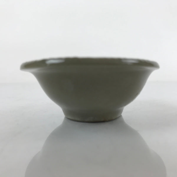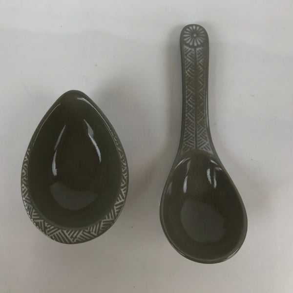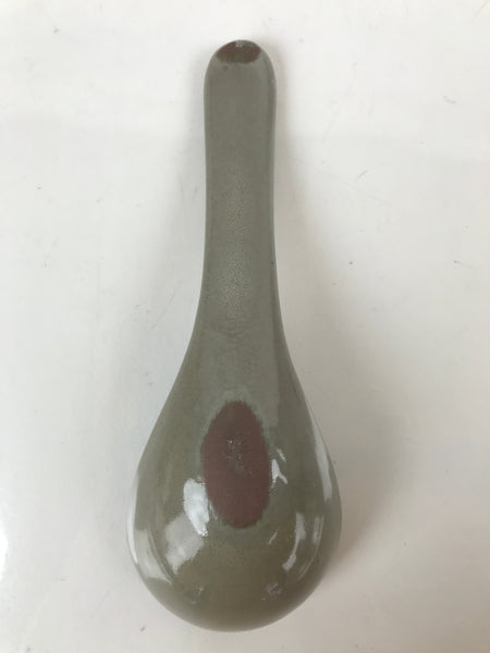 This is a Japanese vintage ceramic spoon with matching stand/rest. This type of spoon (chirirenge/renge) is used when eating ramen noodles or other soup dishes like nabe hot pot. They can also be used to eat fried rice. The spoon has an easy to hold handle and features a solid gray glaze and a white lined pattern with a chrysanthemum at the very end of the handle. This style of pottery is called "banko ware" and is made by Ginpo. The stand is a teardrop shape with the same design and color and has a maker's stamp on the bottom.