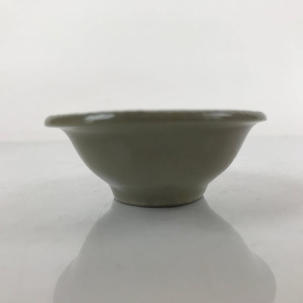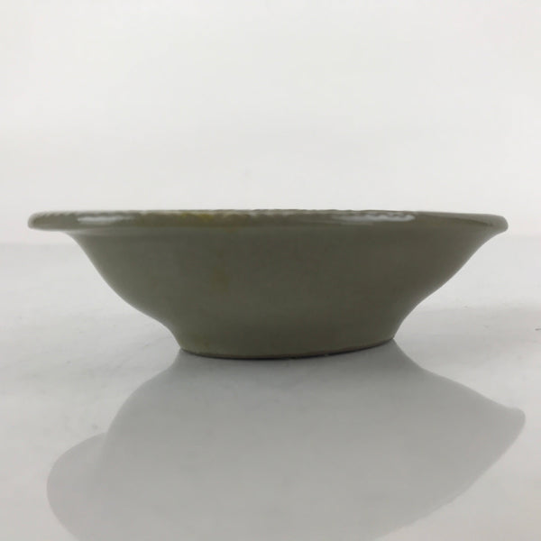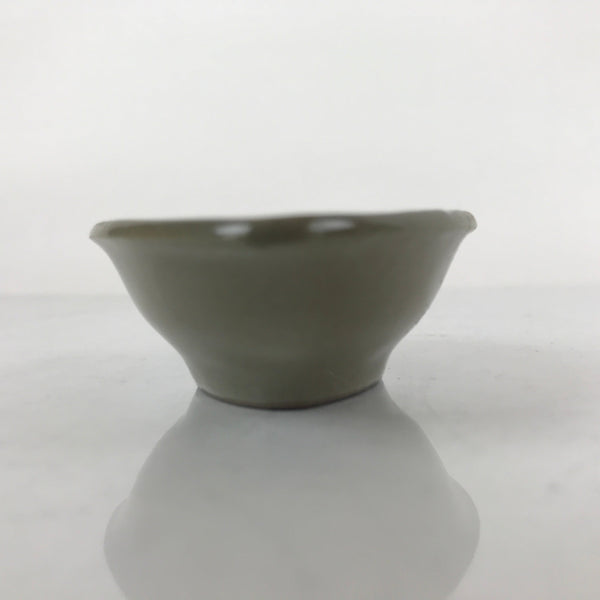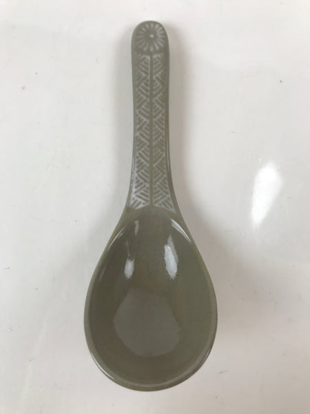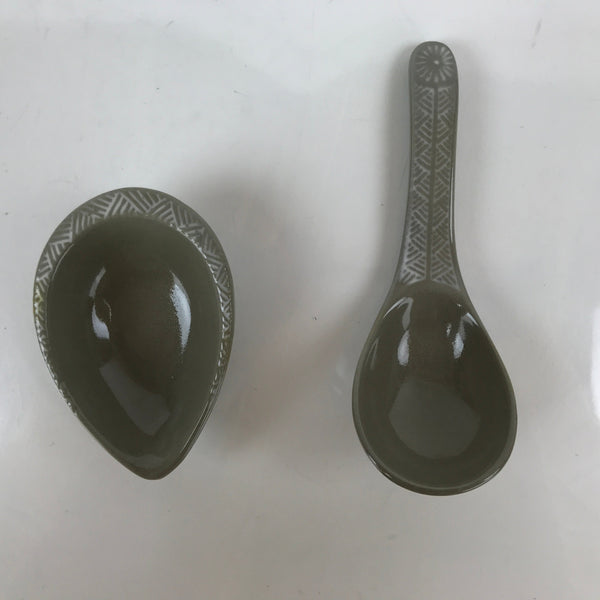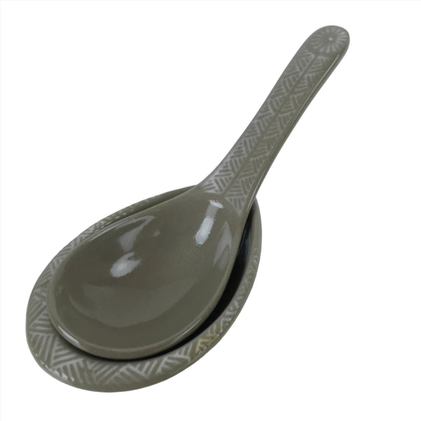 This is a Japanese vintage ceramic spoon with matching stand/rest. This type of spoon (chirirenge/renge) is used when eating ramen noodles or other soup dishes like nabe hot pot. They can also be used to eat fried rice. The spoon has an easy to hold handle and features a solid gray glaze and a white lined pattern with a chrysanthemum at the very end of the handle. This style of pottery is called "banko ware" and is made by Ginpo. The stand is a teardrop shape with the same design and color and has a maker's stamp on the bottom.