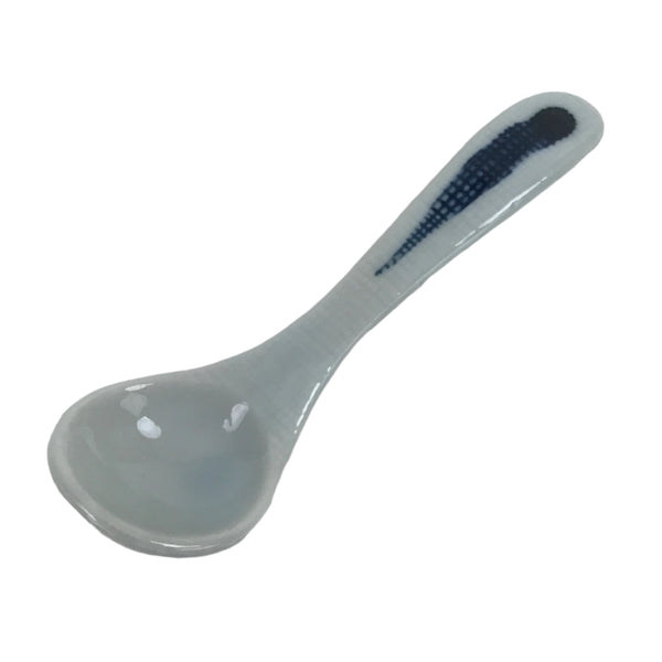 This is a Japanese vintage ceramic spoon. It is small and features a white glaze with blue accent on the handle. Made primarily for eating chawanmushi, a traditional Japanese savory steamed egg custard dish, it is also an excellent choice for puddings, flan, and gelatin desserts as the scoop of the spoon is deep.