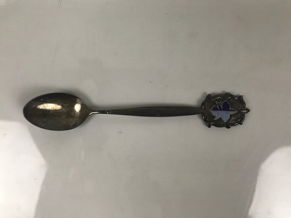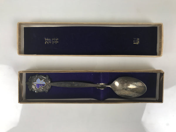 This is a vintage Japanese metal teaspoon cased in a paper box. The box has a thin wooden sheet surface and a purple lining with gold kanji. This spoon is silver in color. The handle is thin and features an emblem with blue enamel. It has a signature on the backside of the handle.
