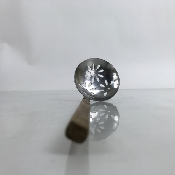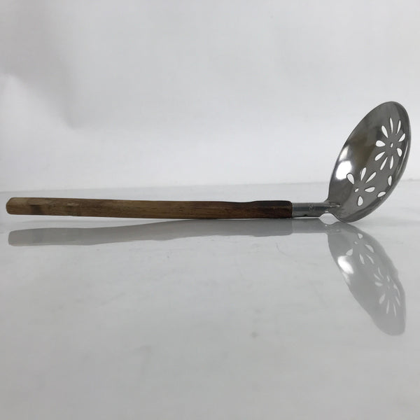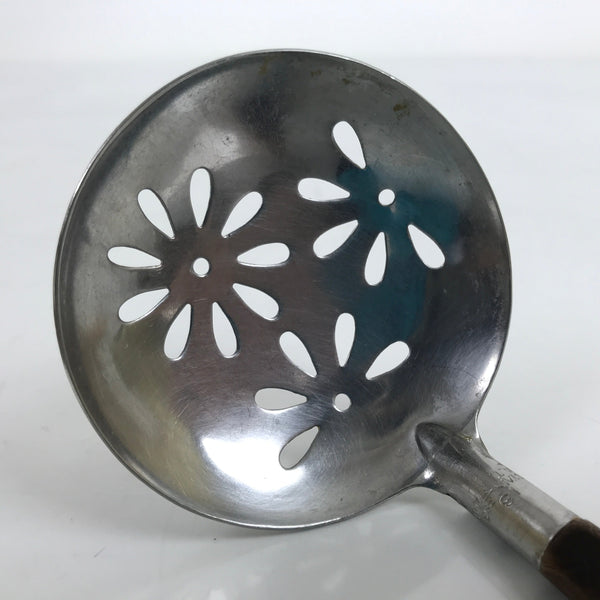 This is a vintage Japanese stainless steel serving ladle or spoon used for nabe hotpot. It has flower-shaped cutouts on the metal piece used for straining solids from liquids. The handle is simple and wooden. This piece makes it easy to remove food items such as vegetables and meats from the pot without filling your personal bowl with excess liquid.