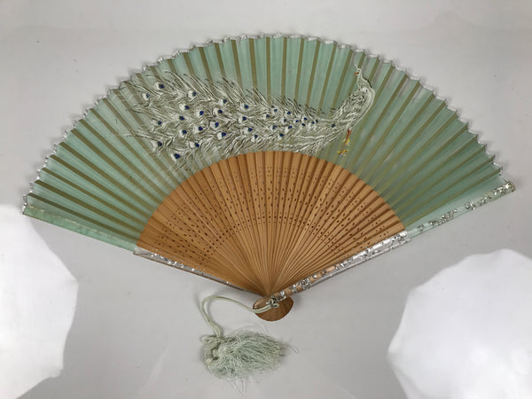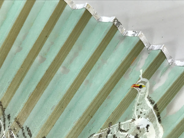 Japanese Fabric Folding Fan Sensu Bamboo Frame White Peacock Bird Green 4D918