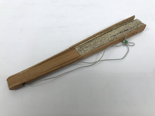 This is a traditional Japanese folding fan called sensu. You can use this when it's hot or as decoration. This decorative fan features gold freckles on the front and the back, and black calligraphy on the front. The inner frame is natural bamboo, and a string with a green bead is attached to it. The previous owner applied tape to a tear in the paper.