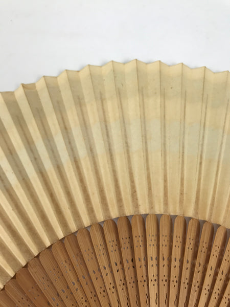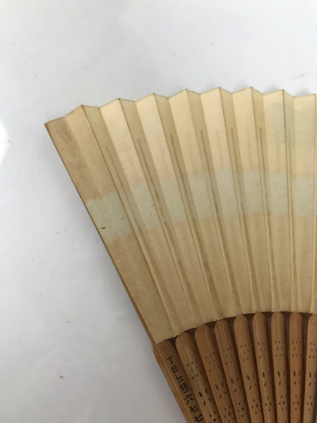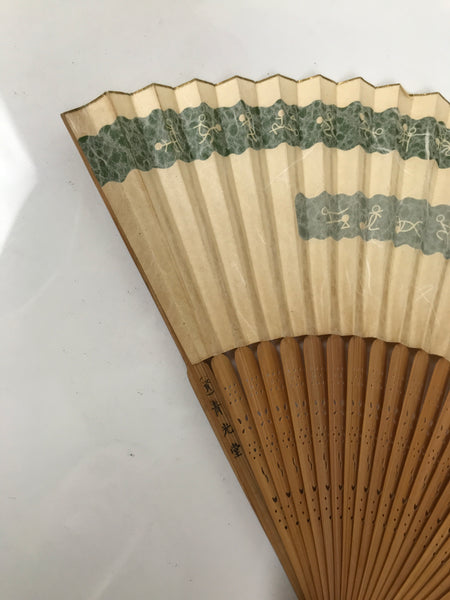 This is a traditional Japanese folding fan called sensu. You can use this when it's hot or as decoration. This fan is made of natural bamboo and is a combination of beige, blue, and green. It features two bands of simplistic figures demonstrating various positions of the Kama Sutra. It has inscriptions on the frame on the front and back. A string with a green resin bead is attached at the bottom.