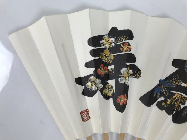 This is a traditional Japanese folding fan called sensu. You can use this when it's hot or as decoration. This decorative fan features three big black kanji characters with colored illustrations of flowers on the inside. The kanji are for prosperity and a long life. The inner frame is natural bamboo. The back of the fan is white with inscriptions on the left.